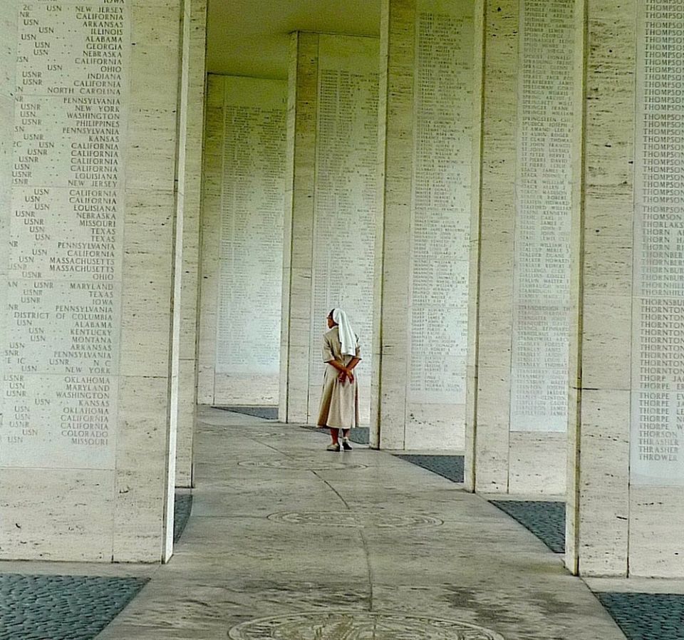 Mahogany trees flank the cemetery’s long-boulevard entrance. Perfectly aligned headstones are laid in 11 concentric circles around the Memorial court. At the end of gentle steps to the court is a 60-foot high chapel, standing ramrod to the sky, gracing over two wide hemicycles of travertine limestone surrounding the court. Twenty-four pairs of fin walls support the hemicycles bearing the chiseled names of 36,285 men and women from the Navy, Army, Air Force, the Marine Corps, the Coast Guard and the Philippine Scouts. The names on the walls mean their bodies were never found, although a few of the remains have been found along the years.