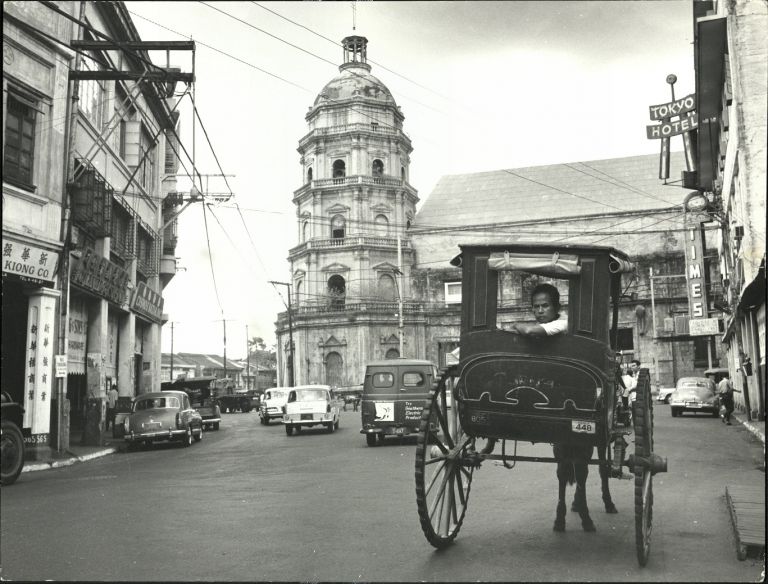 Subject: An apparently post-war view of a commercial street in Binondo, with cars and a calesa passing by Binondo church bell tower (contrast this image with OFI-001036). Binondo Church is located in