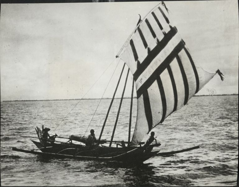 Subject: A vinta (sailboat from the Sulu archipelago) sais on open water with three men on board.