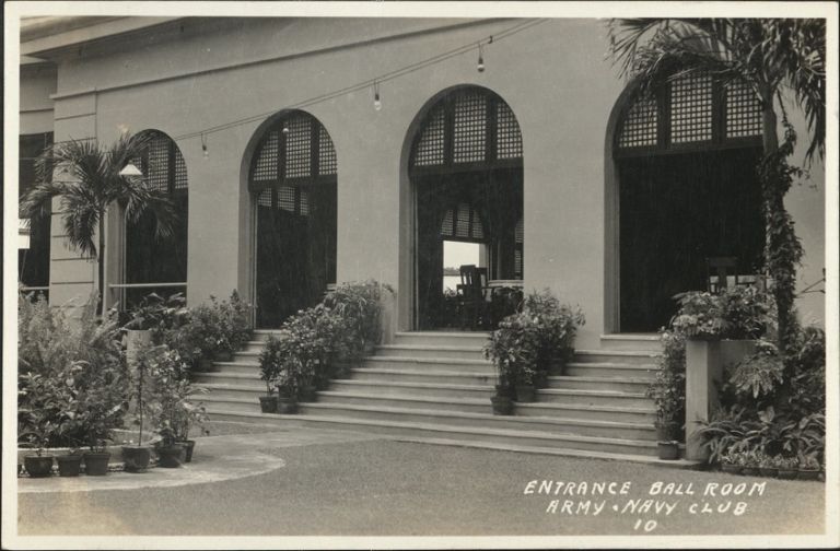 Subject: The exterior entry to the ballroom of the Army & Navy Club in Manila. Founded in 1898, this building was opened in 1911, originally a social club for U.S. Army and Navy officers, servic