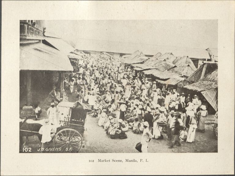 Subject: Buyers and sellers at a busy produce market in Manila. Givens was the post photographer at the Presidio of San Francisco starting in 1899. In 1900 he traveled to