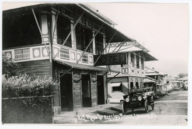 View down Main Street, Los Banos, Laguna Province, with store, hotel, and 1920s-era automobile parked on the street.