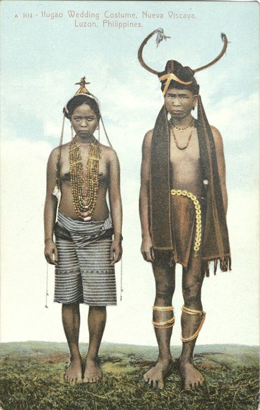 Subject: The elaborate headdress and G-string of the man and the heavy necklace of heirloom beads of the woman typify the traditional Ifugao costume of the early 20th century.