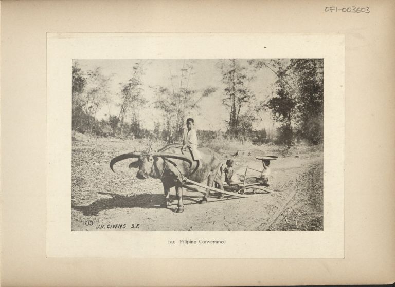 Subject: Boy rides carabao pulling sled with two small girls aboard on a Philippine road. Also published as a postcard, see ROJR-001328. Givens was the post photographer