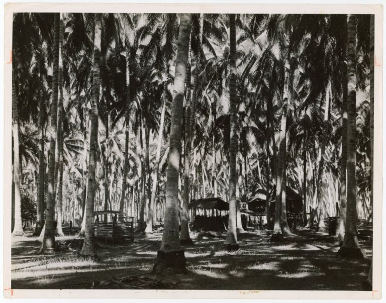 A coconut plantation in Zamboanga with nipa houses and other structures. Full caption continues: "Coconut palm plantation in Zamboanga, the Philippines. The fruit is brought down by skilled coconut climber.