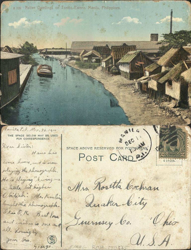 Subject: Houses and boats along canal in Tondo District, Manila.