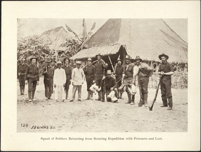 Subject: U.S. soldiers pose with two captured Filipino men and some chickens or ducks they killed. Givens was the post photographer at the Presidio of San Francisco starting in 1899. In 19