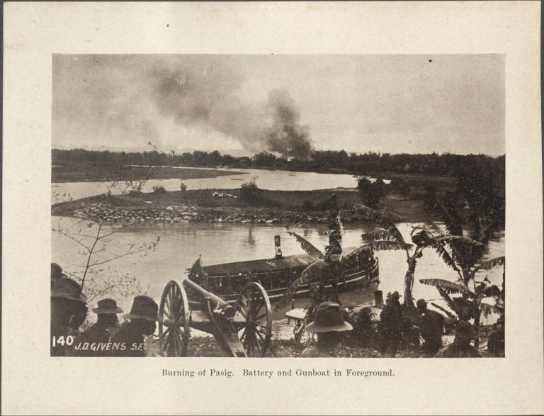 Subject: Pasig City burns in the distance with U.S. soldiers, a cannon, and a gunboat line the banks of the Pasig River. Givens was the post photographer at the Presidio o