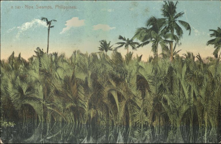 Subject: Nipa palms (�Nypa fruticans�) growing in water with a few coconut palms. It is the only palm considered adapted to the mangrove habitat.
