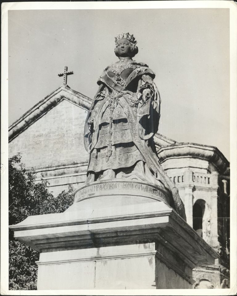 Subject: Statue of Queen Isabel II of Spain in Malate Square, with Malate Church in the background. The monument was erected amidst festive ceremonies on 14 July 1860 near Plaza Lawton. The statue was