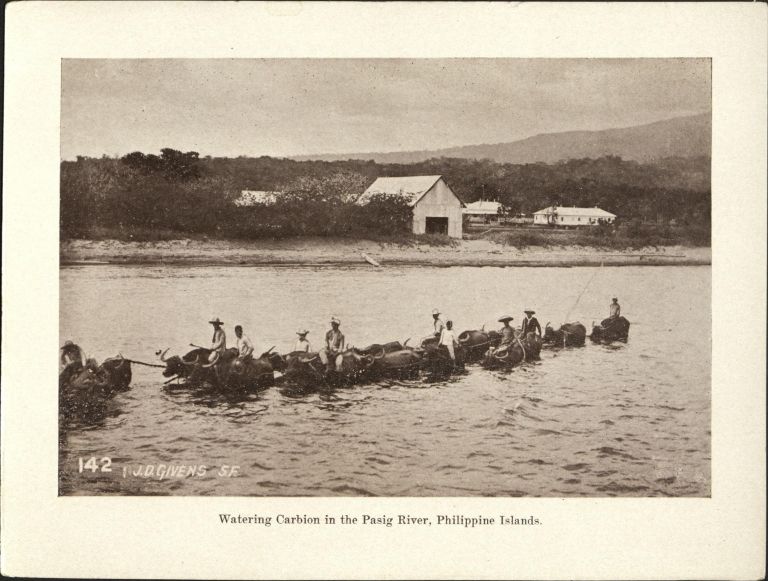 Subject: Filipinos ride a herd of carabao crossing the Pasig River. Givens was the post photographer at the Presidio of San Francisco starting in 1899. In 1900 he traveled to the Philippin