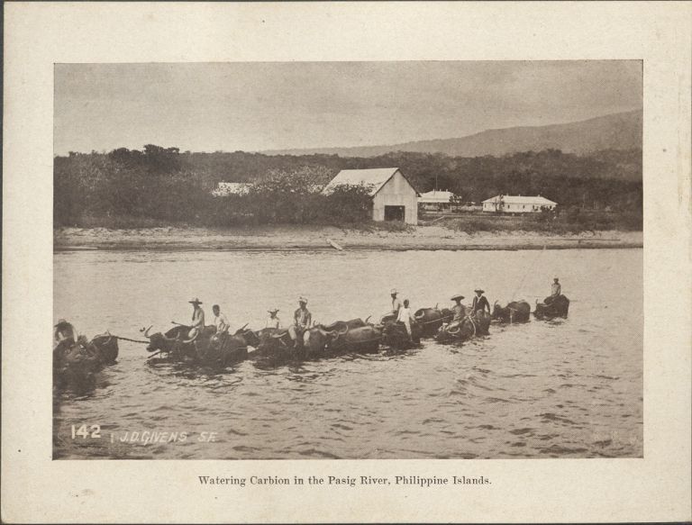 Subject: Filipinos ride a herd of carabao crossing the Pasig River. Givens was the post photographer at the Presidio of San Francisco starting in 1899. In 1900 he traveled