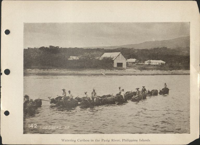 Subject: Filipinos ride a herd of carabao crossing the Pasig River. Givens was the post photographer at the Presidio of San Francisco starting in 1899. In 1900 he traveled to the Philippin