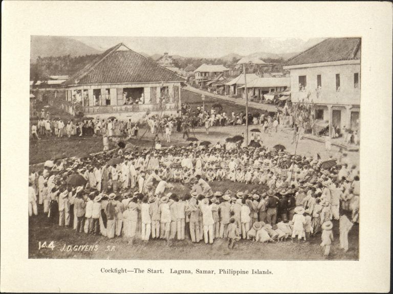 Subject: A large circle of spectators watch cock fights among the buildings of Laguan, Samar Island. Givens was the post photographer at the Presidio of San Francisco starting in 1899. In