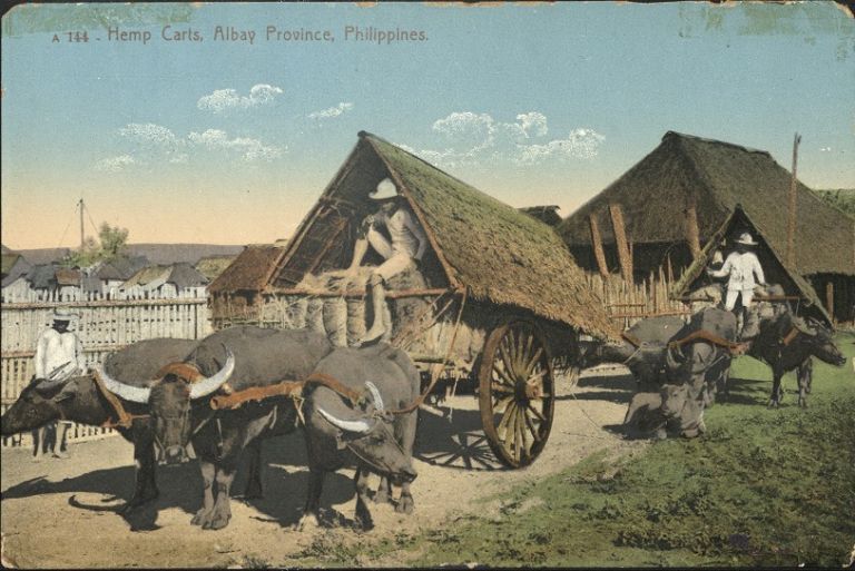 Subject: Teams of carabao pulling two covered carts loaded with hemp in Albay Province. See also OFI-006142 for this same image as a real photograph, where it is captioned in Tabaco, Albay..