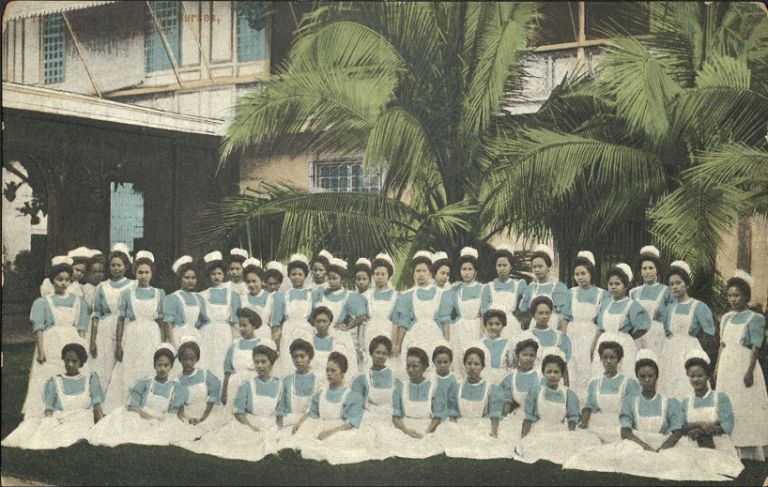 Subject: Group of about 44 Filipina nurses (or nursing students) in uniforms and hats pose outside a building, possibly Union Mission Hospital Training School for Nurses, which was established in 1906