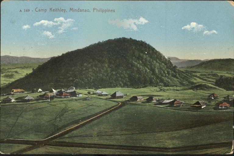 Subject: Camp Keithley�s buildings and forested Sacred Mountain. Camp Keithley was a U.S. Army garrison near Marawi City named for Guy Furnando (Fernando) Keithley, a U.S. Army private killed in