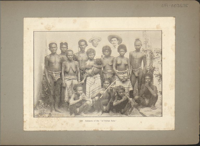 Subject: Muslim men and women of the Sulu archipelago pose with two soldiers. Givens was the post photographer at the Presidio of San Francisco starting in 1899. In 1900 h