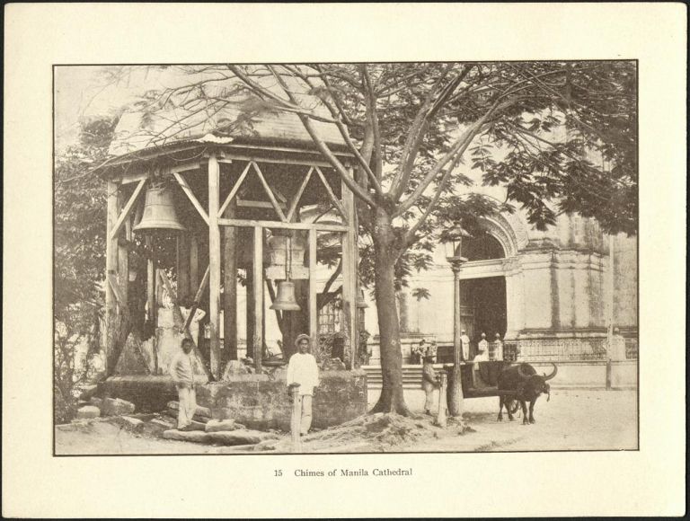 Subject: The bells for Manila Cathedral in Intramuros were across the street in Plaza McKinley (now Plaza Roma); the bell tower was toppled by eartquake in 1880. Givens was the post photog