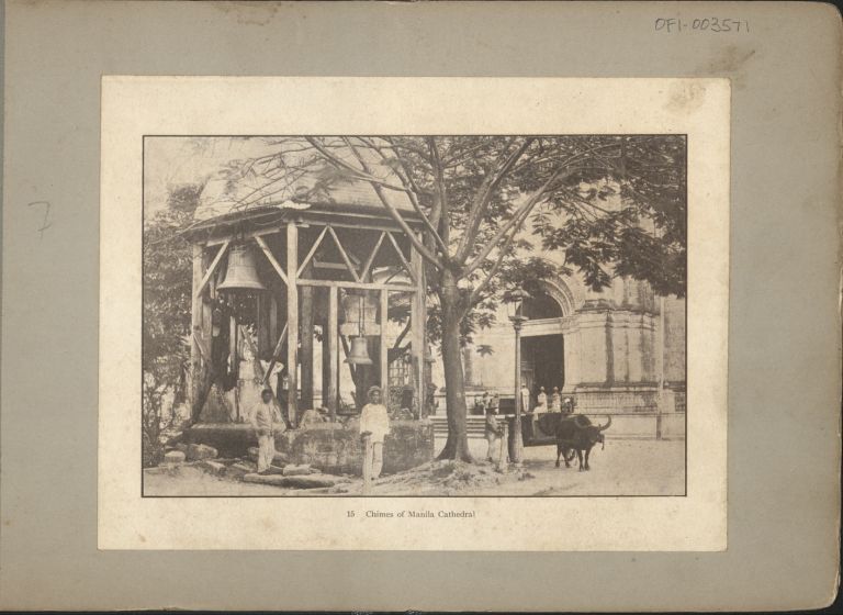 Subject: The bells for Manila Cathedral in Intramuros were across the street in Plaza McKinley (now Plaza Roma); the bell tower was toppled by eartquake in 1880. Givens wa