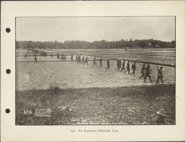 Subject: U.S. soldiers advancing through dried rice fields in a skirmish line, a ragged line with men about five paces apart, taking cover whenever available. The Germans would use this fo