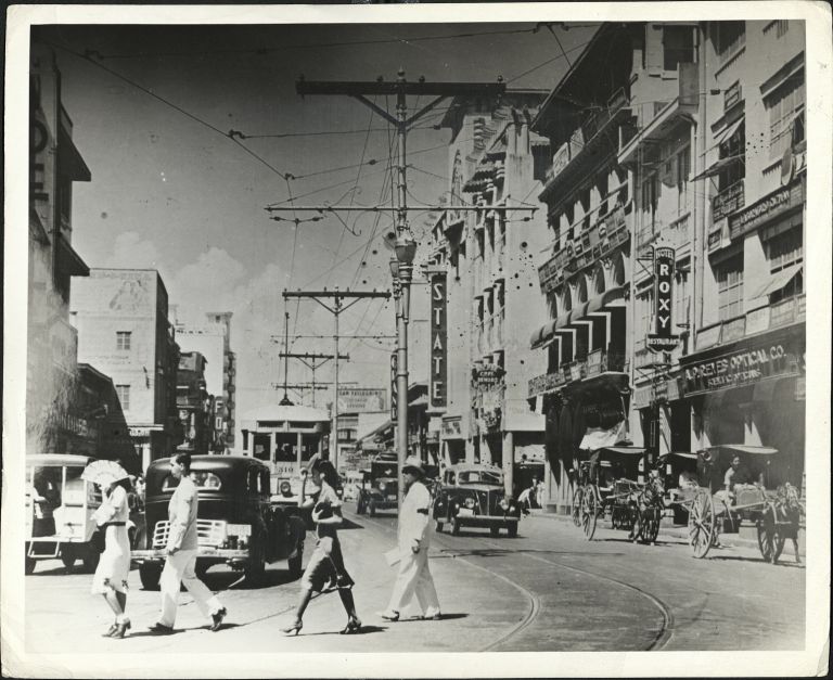 Subject: Busy Rizal Avenue in Santa Cruz, Manila, with pedestrians, automobiles, streetcar, calesas, and several movie theaters. See also OFI-004823 for a similar view in the postwar years.
