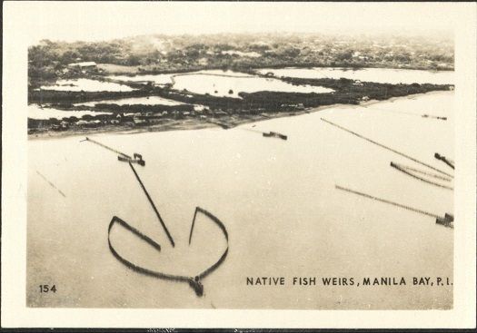 Subject: Fish weirs used to trap fish in Manila Bay. As fish swim near the shore, they encounter the weir's net-covered fence, which directs them into the weir. The inward-turned mouth of the weir red