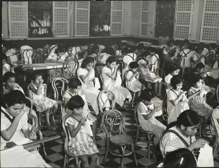 Subject: Girls in cotton dresses sit on bentwood chairs in an orphanage doing embrodery for sale. Modern child-labor activists would be aghast. Full caption continues: "They are doing fine and beautif