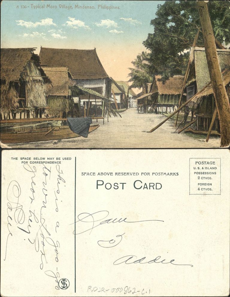 Subject: Huts and boat in a Moro (Muslim) Philippine village on Mindanao Island.