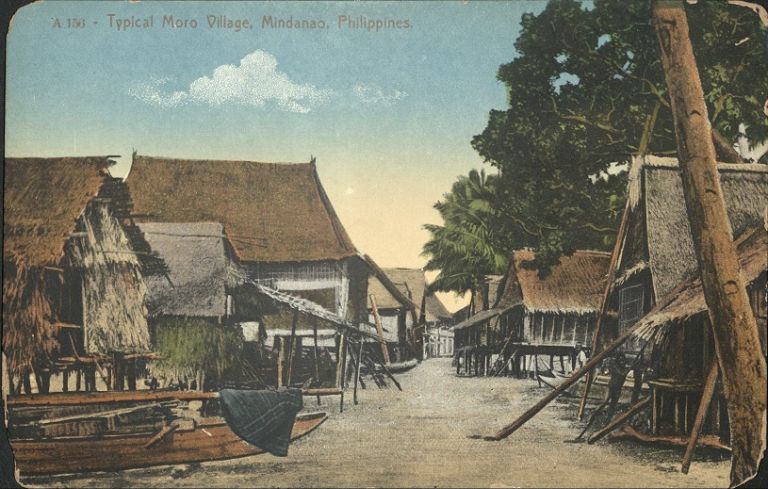 Subject: Huts and boat in a Moro (Muslim) Philippine village on Mindanao Island.