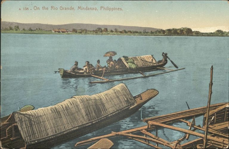 Subject: Outrigger boats with passengers on the Rio Grande de Mindanao, also known as the Mindanao River.