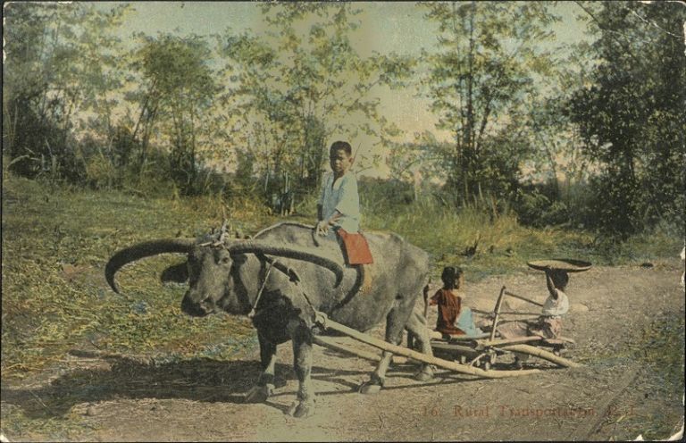 Subject: Boy rides carabao pulling sled with two small girls aboard on a Philippine road.