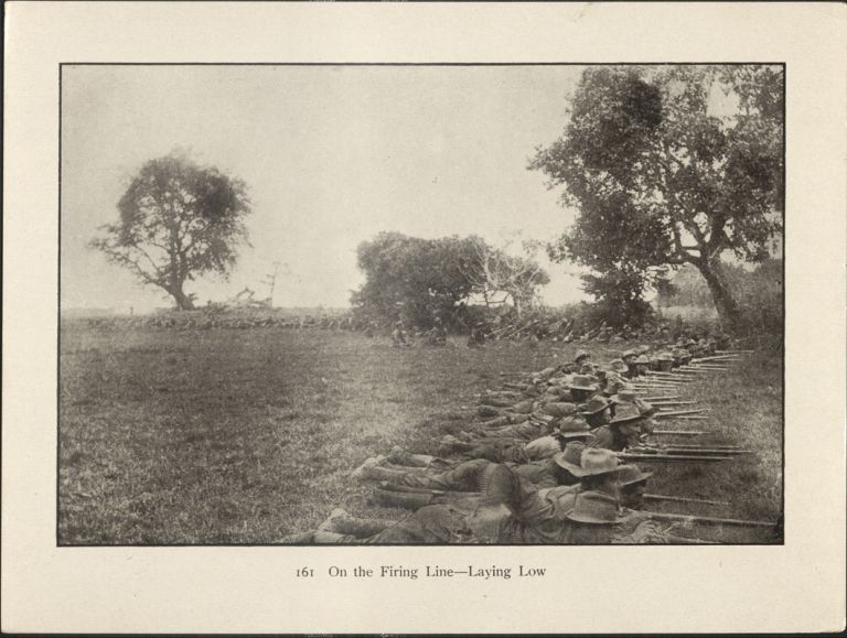 Subject: U.S. soldiers lay prone in firing position in a field, while other soldiers crouch along a brush line. Givens was the post photographer at the Presidio of San Francisco starting i