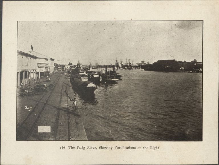 Subject: View looking upriver along a wharf of the Pasig River, with cascos (freight barges) and sailing ships docked at wharves. Across river is Fort Santiago with the do