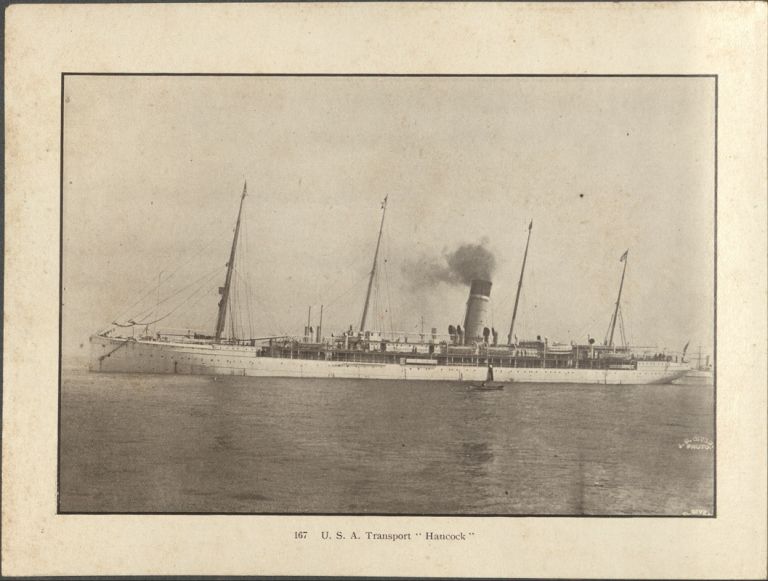 Subject: U.S.A.T. Hancock building steam while in harbor. Originally built as the record breaking British passenger liner "Arizona" serving the Liverpool-New York route, s