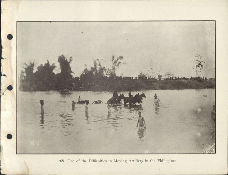 Subject: Team of soldiers on horseback ford a Philippine river pulling a cannon up to its wheel-tops in water; mass of soldiers on far bank. Givens was the post photographer at the Presidi