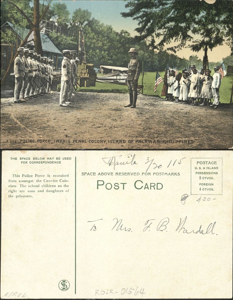 Subject: Policemen, chosen from among the inmates at Iwahig Penal Colony at Puerto Princesa, Palawan, stand at attention for inspection. Group of children with U.S. flags look on.