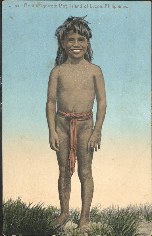 Subject: An Igorot boy stands wearing a loincloth, a big smile and long hair. One of Dean Worcester's "before and after" examples of transforming indigenous people into European dandies. See Mark Rice
