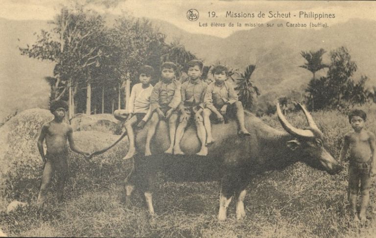 19. Missions de Scheut � Philippines. Les �leves de la mission sur un Carabao (buffle). [The pupils of the mission on a Carabao (buffalo).]