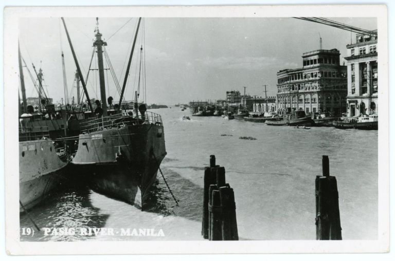 The "Don Esteban"and another vessel anchored near a bridge on the Pasig River, with buildings of Binondo seen across river.