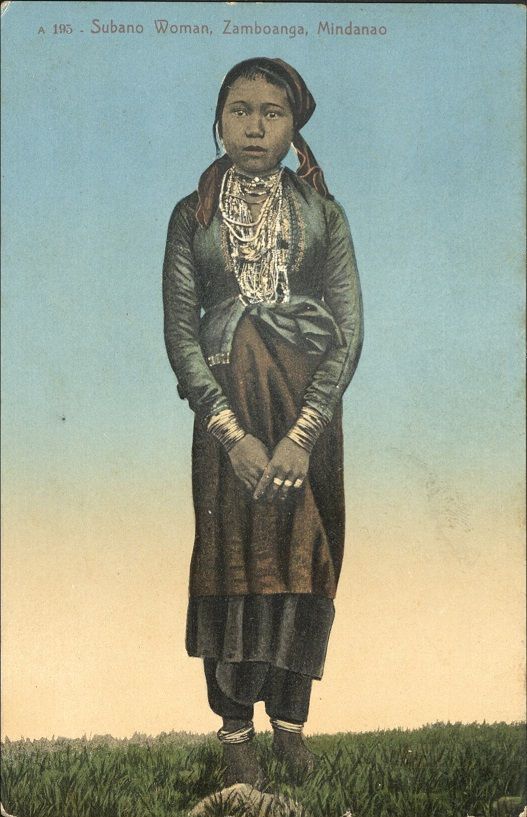 Subject: Young native woman in skirt and jacket with many gold bracelets and necklaces. Subanon (also spelled Subanen or Subanun) is a tribe indigenous to the Zamboanga peninsula area, particularly li