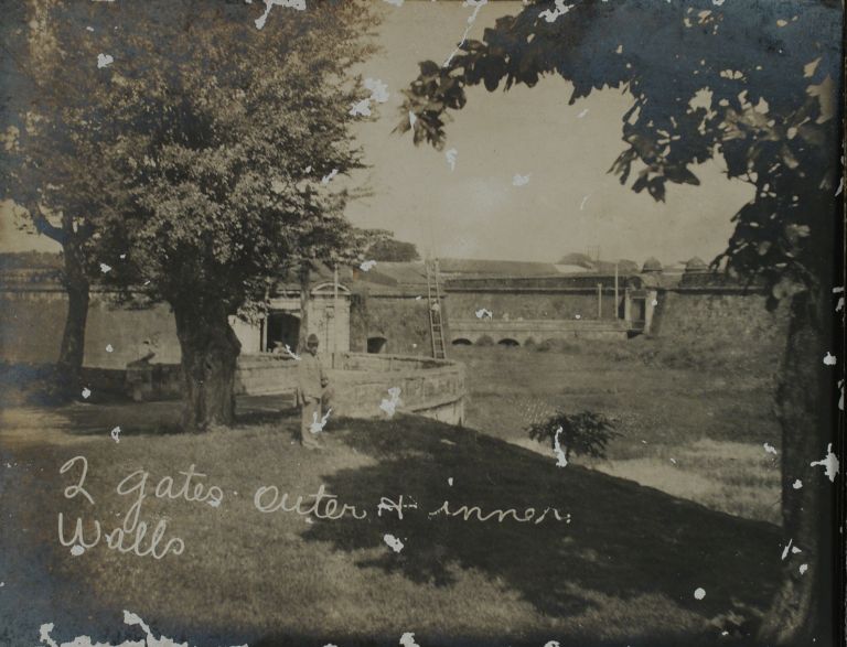 Subject: Structure to the left is the Revellin de Real de Bagumbayan, outside Puerta Real, which is visible on right. The revellin functioned as a defense for a gate where cannons are moun