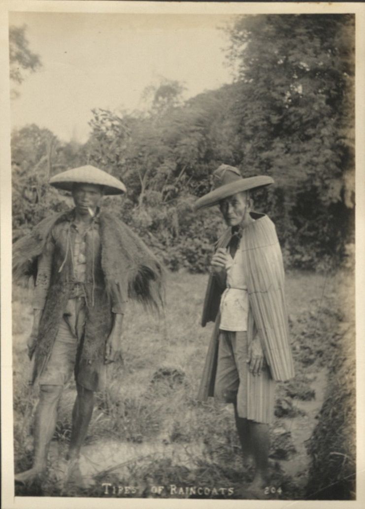 Subject: Two Filipino men stand in a jungle clearing wearing hats and shawls or capes woven from local plant fibers for weather protection.