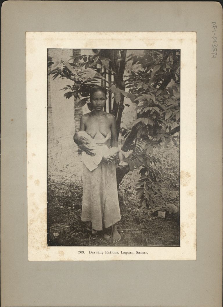 Subject: A Filipino woman with a long skirt and no top poses while breastfeeding her baby. See also OFI-002987. Givens was the post photographer at the Presidio of San Fra