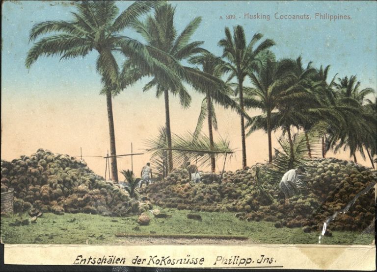 Subject: Men hack at piles of coconuts to remove husks, row of trees (and ships�masts?) background.