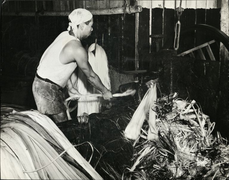 Subject: Filipino worker feeding abaca into a mechanical stripper. Full caption continues: "Spindle type hemp stripping machine in operation. It is from this type of machine that the highest grade hem