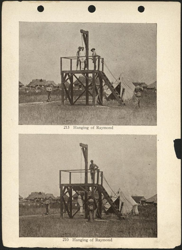 Subject: Pvt. George A. Raymond was hanged Sept. 27, 1901 in the Angeles City town square, having been found guilty of murder, robbery, rape, and desertion. At the last moment he asked to