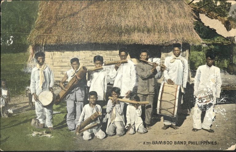 Subject: Ten Filipino musicians pose with bamboo flutes and drums before a nipa hut, sort of a local fife and drum corps band.