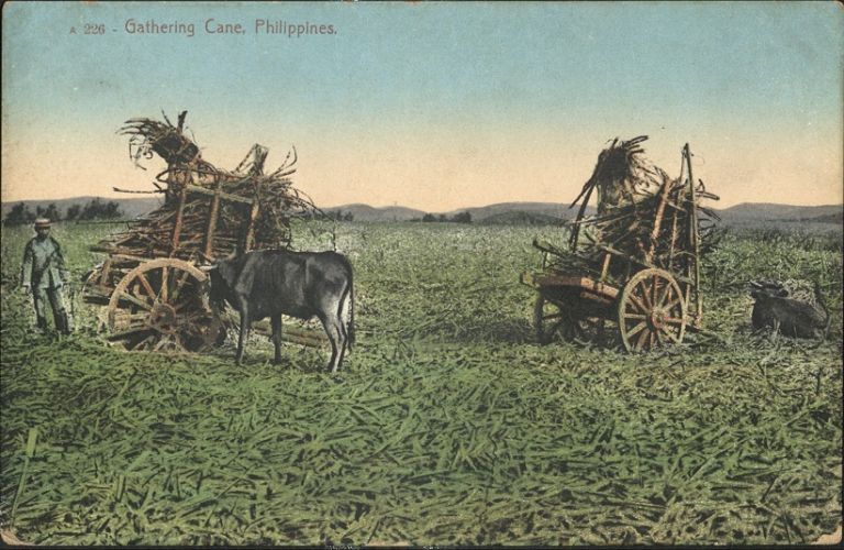 Subject: Two carabao and two carts in sugarcane field, with sugarcane stalks being loaded.