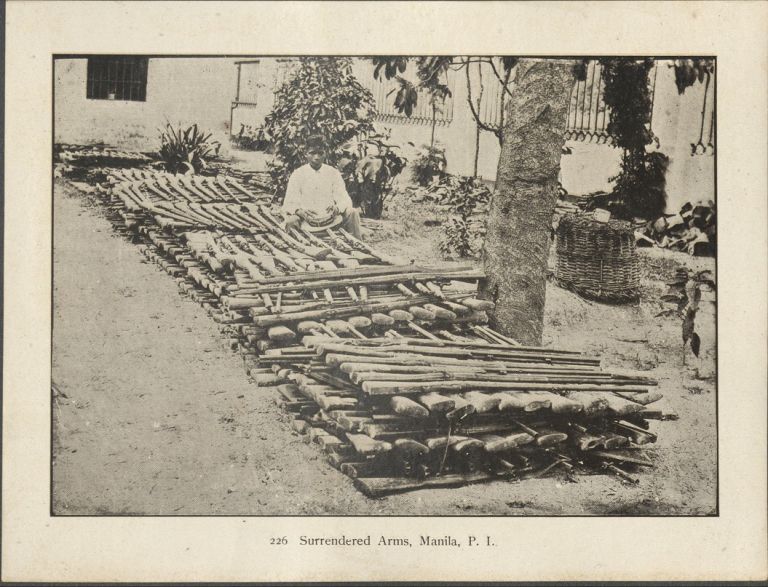 Subject: Neat stacks of captured rifles on the ground in Manila, either from the Spanish or the Filipinos. Givens was the post photographer at the Presidio of San Francisc
